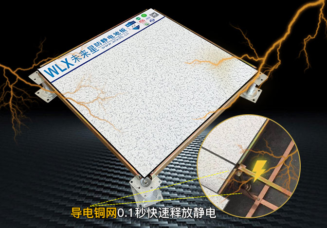 貼面經過抗靜電專利技術研發,填充物增加降阻劑,系統電阻達到國家標準:1.0*10^6Ω-1.0*10^9Ω,通過接地導電銅網,快速釋放房間靜電。